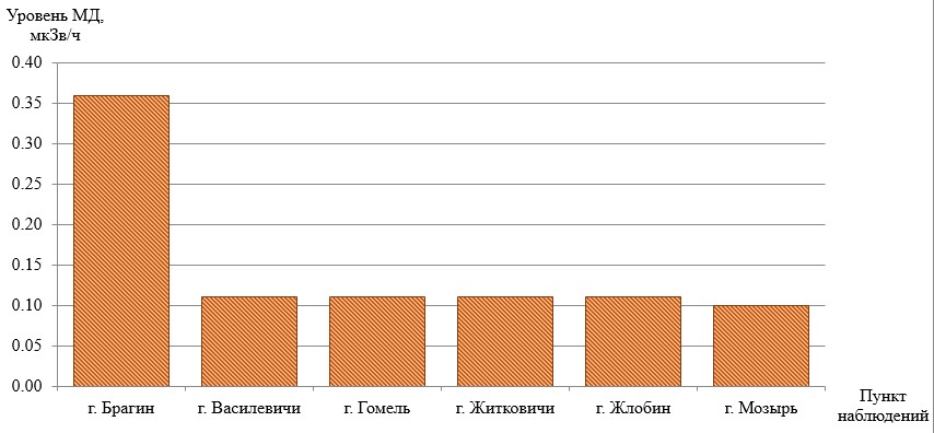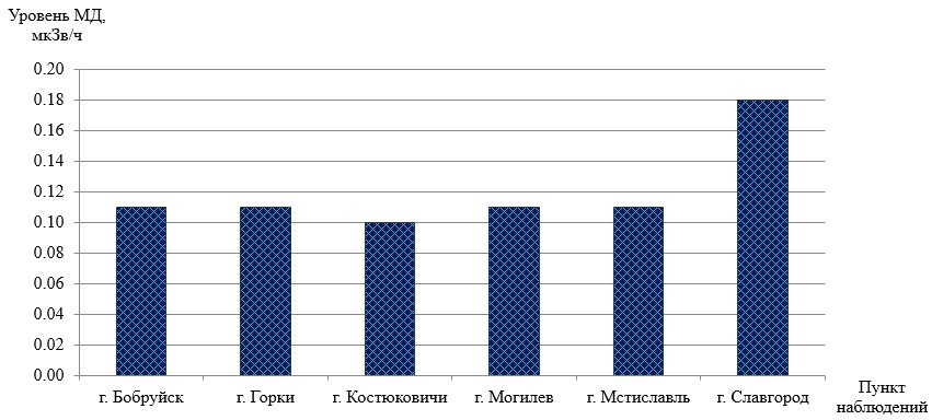 На остальных пунктах наблюдений Гомельской и Могилевской областей уровни МД гамма-излучения не превысили установившиеся многолетние значения и составили от 0,10 до 0,11 мкЗв/ч (рис. 1, рис. 2).