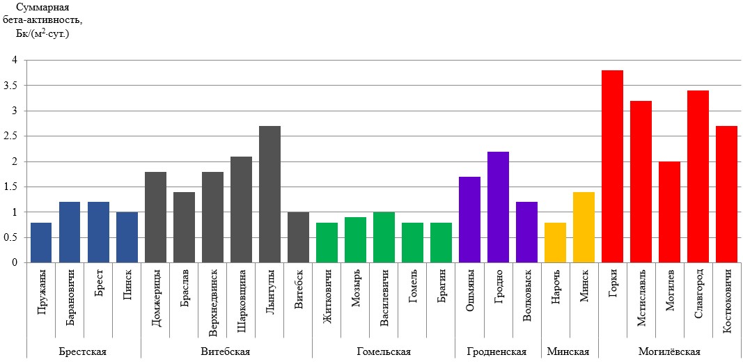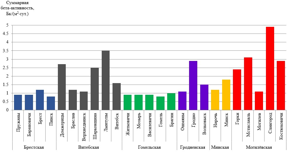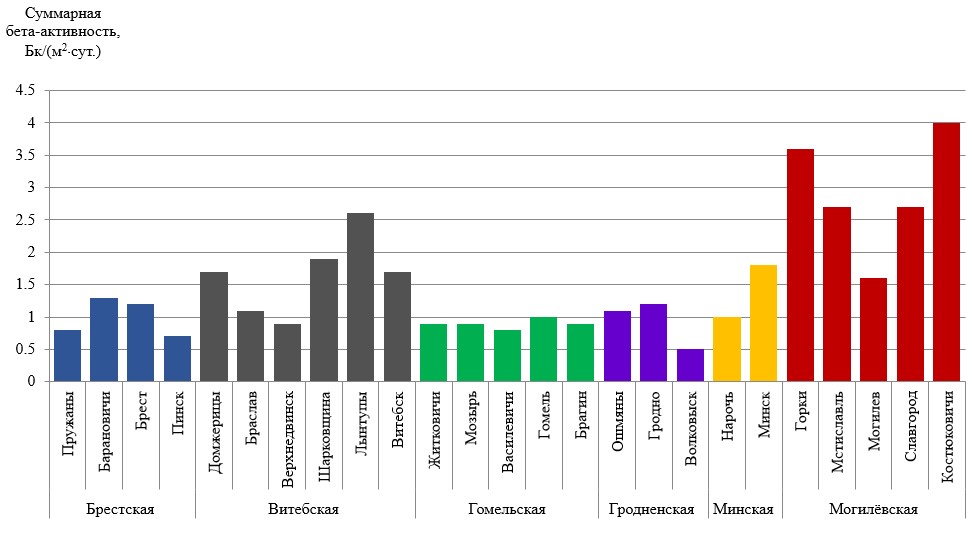Суммарная бета-активность естественных выпадений и аэрозолей в воздухе на территории Республики Беларусь соответствовали установившимся многолетним значениям.