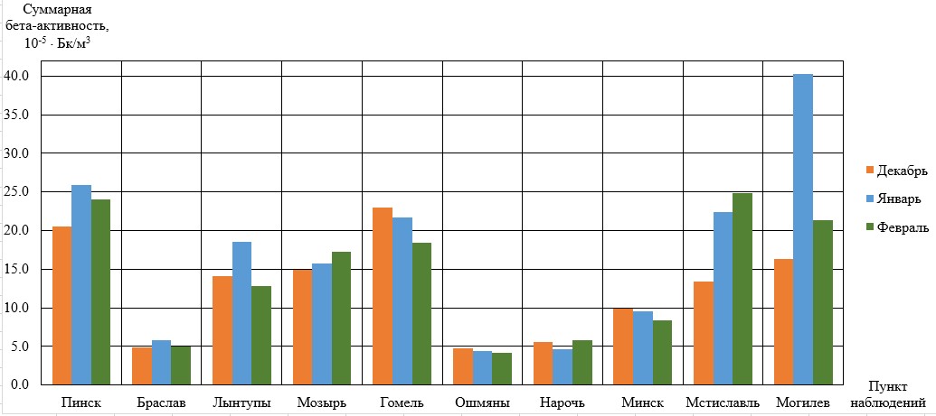 в пункте наблюдений Мстиславль: (24,9 .10-5 Бк/м3) – в феврале.