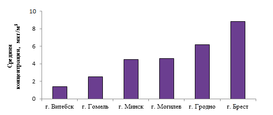 Следует отметить, что в г. Брест уровень загрязнения воздуха формальдегидом выше, чем в других областных центрах республики (рисунок 1).