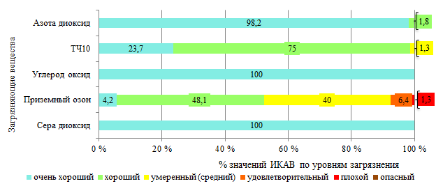 Согласно рассчитанным значениям индекса качества атмосферного воздуха (далее – ИКАВ), состояние воздуха в III квартале 2025 г. оценивалось в основном как очень хорошее, хорошее и умеренное. Периоды с удовлетворительным и плохим уровнями загрязнения воздуха были кратковременными и связаны с увеличением содержания в воздухе приземного озона при повышенном температурном режиме воздуха. Периоды с опасным уровнем загрязнения воздуха отсутствовали (рисунок 2). По сравнению с II кварталом 2025 г. доля периодов с умеренным уровнем загрязнения воздуха приземным озоном была ниже на 10,1 %, с удовлетворительным – ниже на 0,7 %. Доля периодов с умеренным уровнем загрязнения ТЧ10 была ниже на 8,4 %. В аналогичном периоде прошлого года (в III квартале 2024 г.) доля периодов с умеренным уровнем загрязнения воздуха приземным озоном была выше на 6,8 %, с удовлетворительным – ниже на 1,4 %, доля периодов с умеренным уровнем загрязнения воздуха ТЧ10 была на 11,9 % выше.