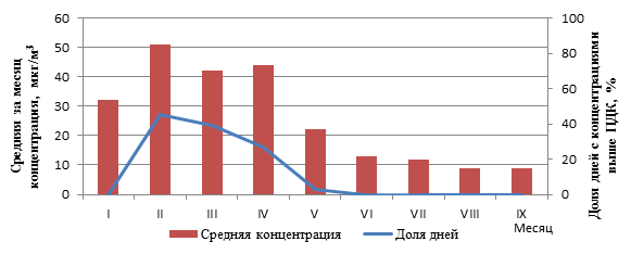 Рисунок 1 – Средние за месяц концентрации ТЧ10 и доля дней с концентрациями выше ПДК в г. Гомель в районе ул. Барыкина, 319 в январе – сентябре 2025 г.