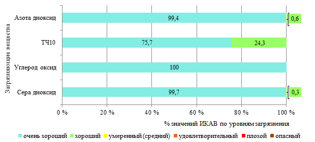 Согласно рассчитанным значениям ИКАВ, состояние воздуха в III квартале 2025 г. оценивалось как очень хорошее и хорошее. Периоды с умеренным, удовлетворительным, плохим и опасным уровнями загрязнения воздуха отсутствовали (рисунок). В предыдущем квартале присутствовали периоды с умеренным, удовлетворительным и плохим уровнями загрязнения воздуха приземным озоном, в аналогичном периоде прошлого года были периоды с умеренным и удовлетворительным уровнями загрязнения воздуха приземным озоном.