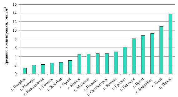 Содержание в воздухе формальдегида определялось в июле – августе. По результатам наблюдений в июле – августе 2025 г. Пинск относится к перечню городов с наиболее высоким содержанием в воздухе формальдегида среди городов республики, где проводятся наблюдения (рисунок).