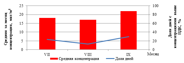 Рисунок 1 – Средние за месяц концентрации ТЧ2,5 и доля дней с концентрациями выше ПДК в г. Жлобин (район ул. Пригородная, д. 12) в июле – сентябре 2025 г.