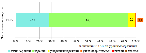 Согласно рассчитанным значениям ИКАВ в III квартале 2025 г. состояние воздуха оценивалось в основном как очень хорошее и хорошее. Периоды с умеренным и удовлетворительным уровнями загрязнения воздуха были непродолжительные. Периоды с плохим и опасным уровнями загрязнения воздуха отсутствовали (рисунок 2). В аналогичном периоде прошлого года (III квартале 2024 г.) доля периодов с умеренным уровнем загрязнения воздуха ТЧ2,5 была больше на 5 %.