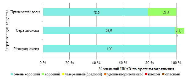 Согласно рассчитанным значениям ИКАВ, состояние воздуха в IV квартале 2025 г. оценивалось в основном хорошее и хорошее. Периоды с умеренным, удовлетворительным, плохим и опасным уровнями загрязнения атмосферного воздуха отсутствовали (рисунок 9). В III квартале 2025 г. наблюдались периоды с умеренным уровнем загрязнения воздуха приземным озоном, в аналогичном квартале прошлого года были непродолжительные периодв с умеренным уровнем загрязнения воздуха приземным озоном и серы диоксидом.