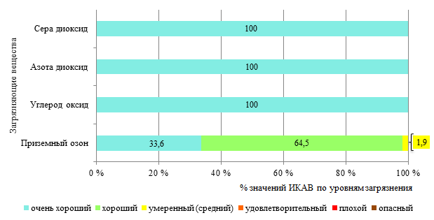 Согласно рассчитанным значениям ИКАВ, состояние воздуха в IV квартале 2025 г. оценивалось в основном как очень хорошее и хорошее. Периоды с умеренным уровнем загрязнения воздуха были непродолжительными и связаны с увеличением в воздухе содержания приземного озона. Периоды с удовлетворительным, плохим и опасным уровнями загрязнения воздуха отсутствовали (рисунок 10). В аналогичном периоде прошлого года (в IV квартале 2024 г.) доля периодов с умеренным уровнем загрязнения воздуха приземным озоном была выше на 2 %.
