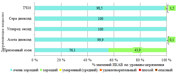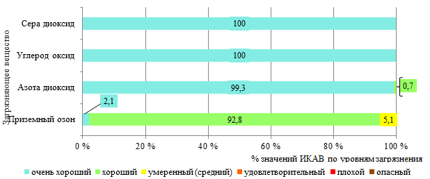Согласно рассчитанным значениям ИКАВ, состояние воздуха в IV квартале 2025 г. оценивалось в основном как очень хорошее и хорошее. Доля периодов с умеренным загрязнением воздуха была непродолжительная и связана с увеличением приземного озона в районе пр-та Шмидта, 19. Периоды с удовлетворительным, плохим и опасным уровнями загрязнения воздуха отсутствовали (рисунки 17 – 19). По сравнению с предыдущим кварталом (c III кварталом 2025 г.) сократилась доля периодов с умеренным уровнем загрязнения воздуха приземным озоном в районе пр-та Шмидта, 19 на 45,3 %. В III квартале 2025 г. наблюдались периоды с удовлетворительным уровнем загрязнения воздуха приземным озоном. В аналогичном периоде прошлого года состояние воздуха оценивалось также как очень хорошее, хорошее и умеренное, доля периодов с умеренным уровнем загрязнения воздуха приземным озоном была несколько ниже (на 2,5 %), периоды с удовлетворительным, плохим и опасным уровнями загрязнения воздуха не наблюдались.
